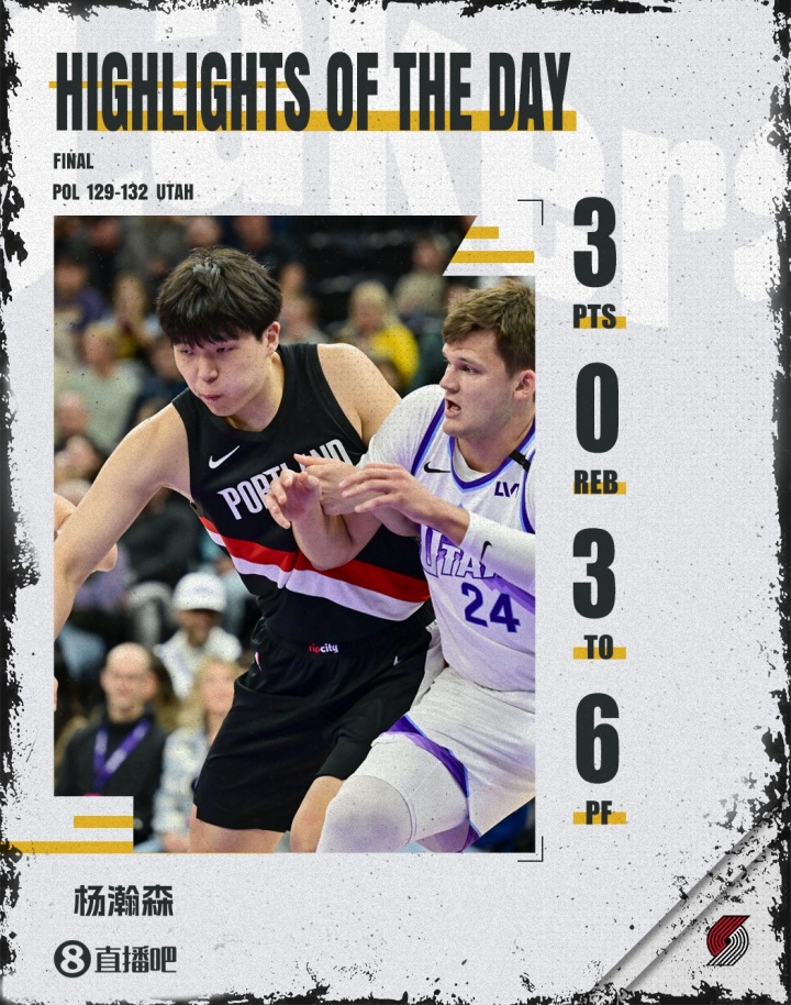 10月17日讯 NBA季前赛,开拓者客场面对爵士,杨瀚森末节六犯离场。